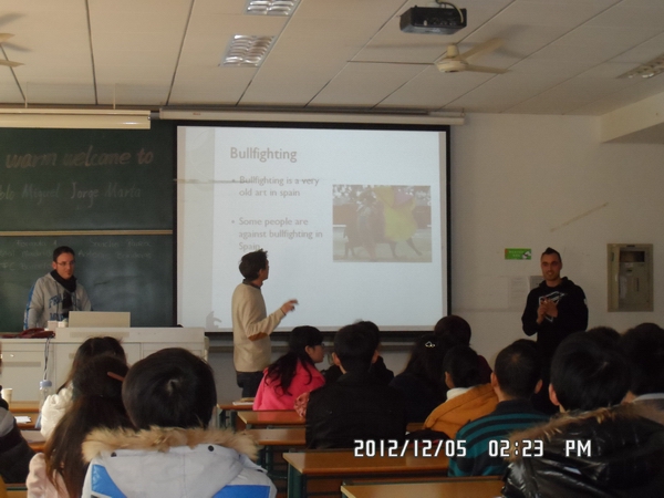 Pablo, Jorge, Marta and Miguel, 4 exchange students from URJC, Spain, came to Classroom 203, Building 11 on Dec. 5, to have a interaction in English with the students from English major students. On the class, the spanish students showed the geography, histry, culture, food, sports and customs of Spain to the Chinese students. Both sides were happy to know a different culture and make new friends with each other.