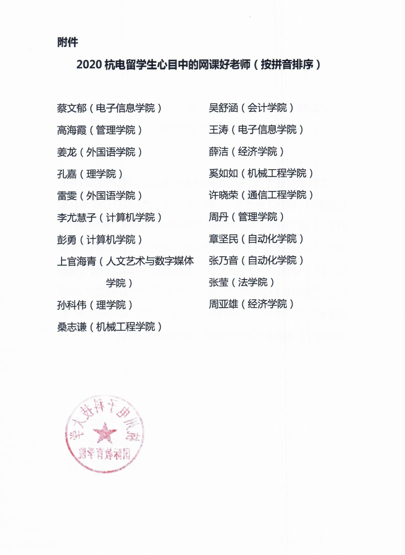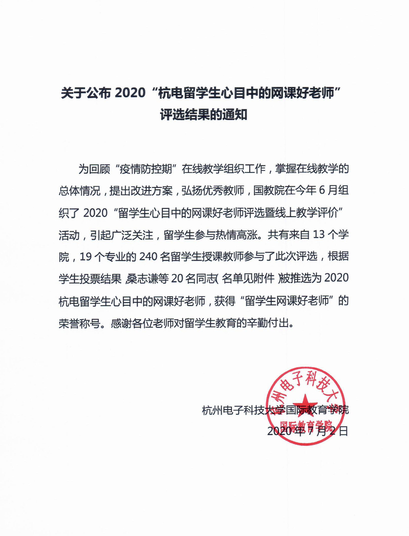 关于公布2020“杭电留学生心目中的网课好老师”评选结果的通知